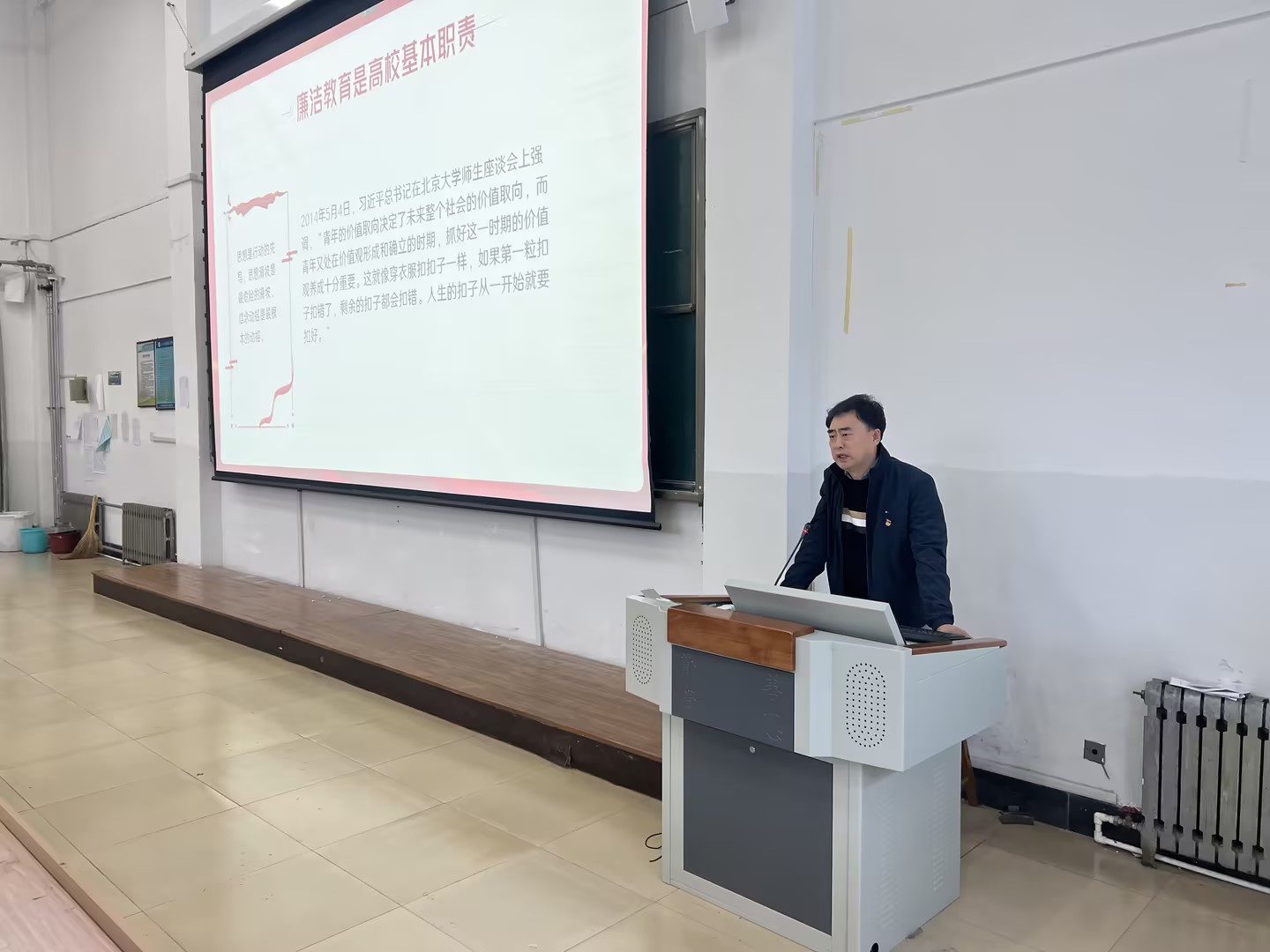 为贯彻落实好省委教育工委关于新时代廉洁文化建设精神,响应学校“清廉商务”文化建设主题活动号召,11月28日,机关第一党支部经过精心筹划、充分准备,为智能制造学院学生开展了廉洁思政大课堂活动。学校纪委委员、机关第一党支部书记孙琳作了主题为“厚植廉洁文化根基,加强青年廉洁教育”的报告,机关第一党支部全体党员及智能制造学院师生300余人参加学习活动。